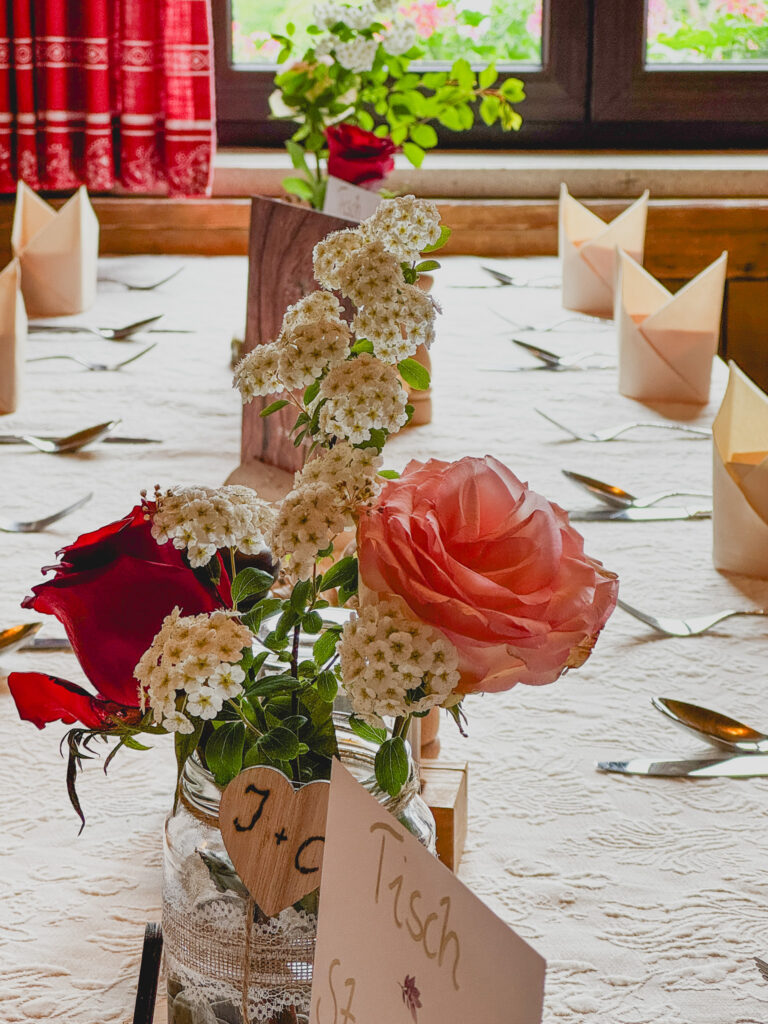 Rund um eure Hochzeit unterstützen wir euch auf Wunsch auch bei Dekoration, Bestuhlung, Tischplan, Technik und Koordination mit externen Dienstleistern wie Fotograf, DJ oder Band. Viele Details – von Tischwäsche über Kerzen bis hin zu Menükarten – können wir flexibel an euer Farb- und Deko-Konzept anpassen.